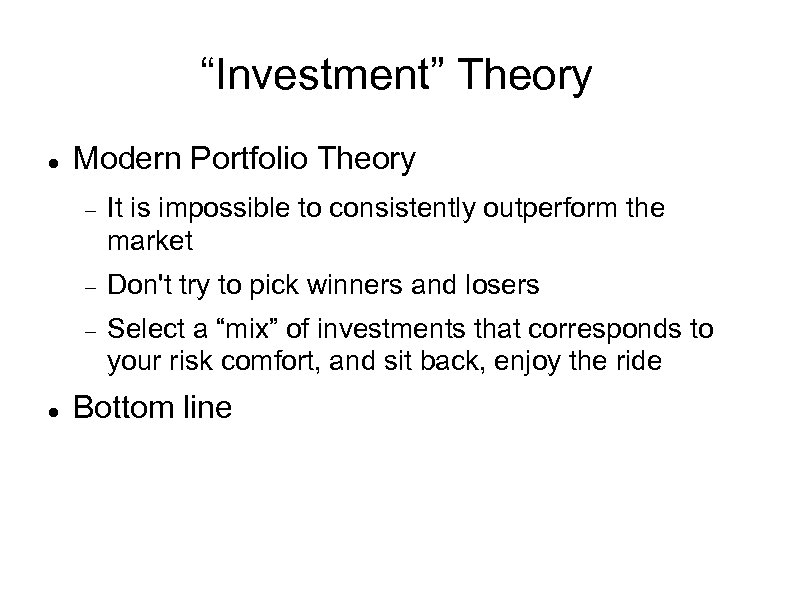“Investment” Theory Modern Portfolio Theory Don't try to pick winners and losers It is impossible to consistently outperform the market Select a “mix” of investments that corresponds to your risk comfort, and sit back, enjoy the ride Bottom line
