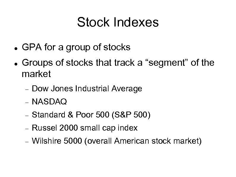 Stock Indexes GPA for a group of stocks Groups of stocks that track a “segment” of the market Dow Jones Industrial Average NASDAQ Standard & Poor 500 (S&P 500) Russel 2000 small cap index Wilshire 5000 (overall American stock market)
