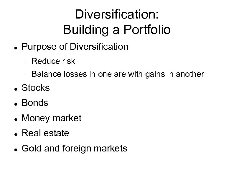 Diversification: Building a Portfolio Purpose of Diversification Reduce risk Balance losses in one are with gains in another Stocks Bonds Money market Real estate Gold and foreign markets