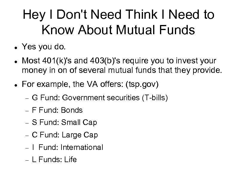Hey I Don't Need Think I Need to Know About Mutual Funds Yes you do. Most 401(k)'s and 403(b)'s require you to invest your money in on of several mutual funds that they provide. For example, the VA offers: (tsp. gov) G Fund: Government securities (T-bills) F Fund: Bonds S Fund: Small Cap C Fund: Large Cap I Fund: International L Funds: Life