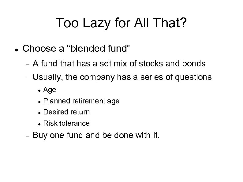Too Lazy for All That? Choose a “blended fund” A fund that has a set mix of stocks and bonds Usually, the company has a series of questions Planned retirement age Desired return Age Risk tolerance Buy one fund and be done with it.