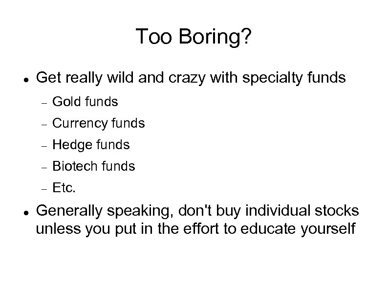 Too Boring? Get really wild and crazy with specialty funds Currency funds Hedge funds Biotech funds Gold funds Etc. Generally speaking, don't buy individual stocks unless you put in the effort to educate yourself