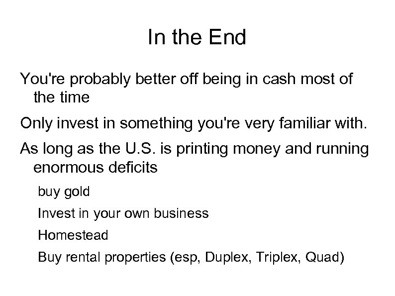 In the End You're probably better off being in cash most of the time Only invest in something you're very familiar with. As long as the U. S. is printing money and running enormous deficits buy gold Invest in your own business Homestead Buy rental properties (esp, Duplex, Triplex, Quad)