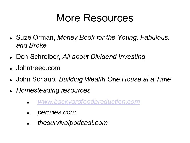 More Resources Suze Orman, Money Book for the Young, Fabulous, and Broke Don Schreiber, All about Dividend Investing Johntreed. com John Schaub, Building Wealth One House at a Time Homesteading resources www. backyardfoodproduction. com permies. com thesurvivalpodcast. com