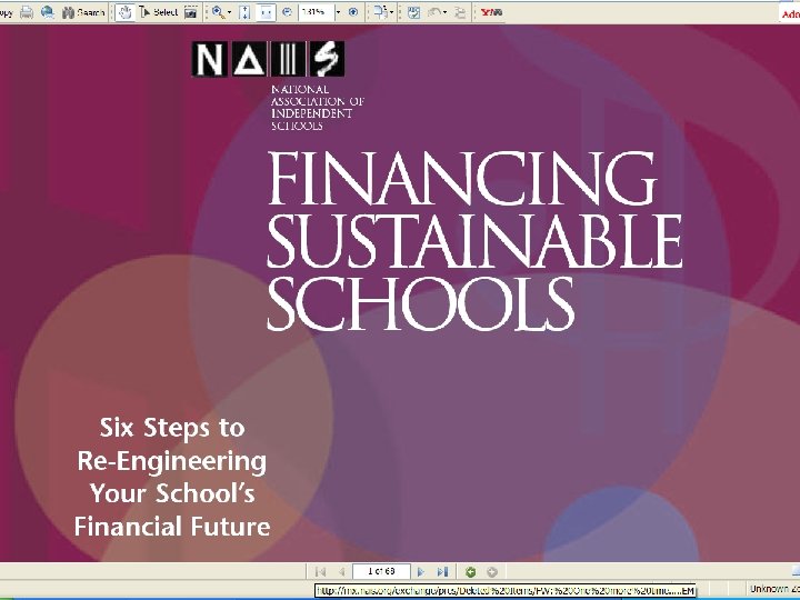 6 -Steps: Financially Sustainable Schools: High Stakes Planning 4. Data Markers of School Success: How does your school measure success? What are the budget-related factors that function as "proxies" for success? 5. Re-engineering Strategies: What are the "brutal facts" about your current financial position? Where are you vulnerable now or potentially in the future? What strengths can you capitalize upon? What are your means for diversifying income and containing costs? 6. Projecting Alternative and Preferred Financial Futures: What are the likely, possible, and preferred financial futures for your school, and what decisions will you have to make to achieve your objectives?