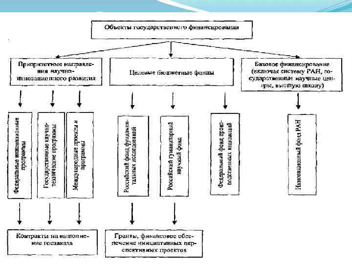 Участие государства в финансовом обеспечении инновационных процессов предполагает: аккумулирование средств на научные исследования и инновации - как за счет действия общих механизмов перераспределения через бюджет, так и за счет формирования специальных фондов; стимулирование инноваций — различные финансовые субсидии и льготы, страхование инновационных рисков, санкции за выпуск устаревающей продукции. Механизм государственного финансирования инновационной деятельности может включать как непосредственную финансовую поддержку централизованными средствами (прямое финансирование), так и создание условий для использования рыночного механизма привлечения средств (косвенное финансирование).