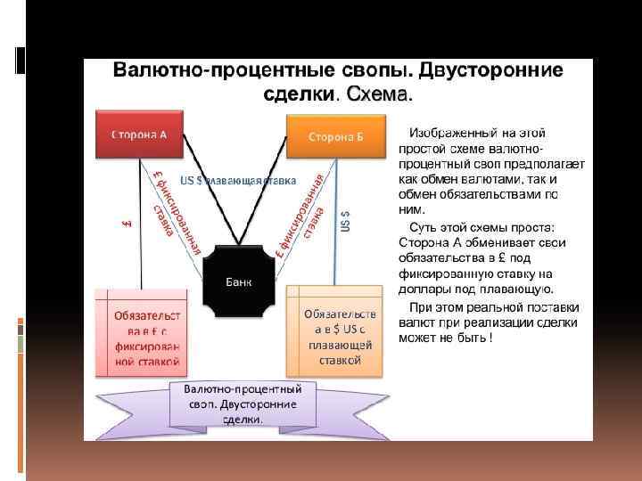 Валютно-процентный своп Своп представляет собой валютную операцию по обмену между субъектами обязательствами или активами. Традиционные свопы — это валютный своп и процентный своп. Валютный своп представляет собой покупку и одновременную форвардную продажу валюты (депорт) или, наоборот, продажу и одновременную форвардную покупку валюты (репорт). Процентный своп — это обмен процентными ставками по заемным средствам. Сочетание этих двух свопов ведет к совершенно новой финансовой операции: валютно-процентному свопу. Валютно-процентный своп представляет собой обмен как валютами, так и процентами. Этот вид свопа может быть заключен между несколькими участниками