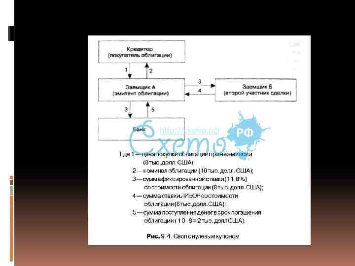 Своп с нулевым купоном Нулевой купон означает отсутствие купонного дохода. При этом доход по ценной бумаге образуется не за счет процентов, начисленных на номинальную стоимость ценной бумаги, а за счет скидки (дисконта) с номинальной стоимости ценной бумаги при ее продаже и погашении ценной бумаги по номинальной стоимости (облигации ГКО, ОФЗ, МКО и др. ). Сущность свопа с нулевым купоном заключается в том, что эмитент бескупонной облигации может осуществить обмен фиксированного дохода на доход по плавающей процентной ставке путем одновременного процентного свопа и обратного ежегодного платежа.