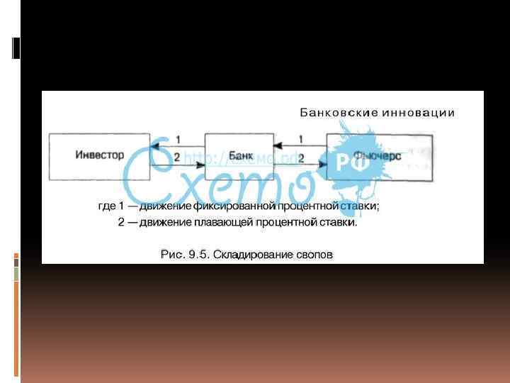 Складирование свопов Складирование свопов (англ. warehousing of swaps) - это заключение договора о свопе с банком и его страхование (обычно фьючерсами) до того момента, пока банк не подыщет вторую сторону договора о свопе. Сделки заключаются по требованию, и наличие второй стороны в момент заключения не обязательно. Возможна, например, следующая схема складирования свопов. Банк заключает с инвестором договор об обмене процентными ставками и одновременно производит страхование величины процентной ставки. Например, фиксированная процентная ставка - 10 % годовых. Величина плавающей ставки устанавливается в ходе торгов на валютной бирже. С целью страхования риска от снижения величины фиксированной ставки ниже величины плавающей ставки банк приобрел шестимесячный фьючерсный контракт на получение процентной ставки в размере 10 % годовых.