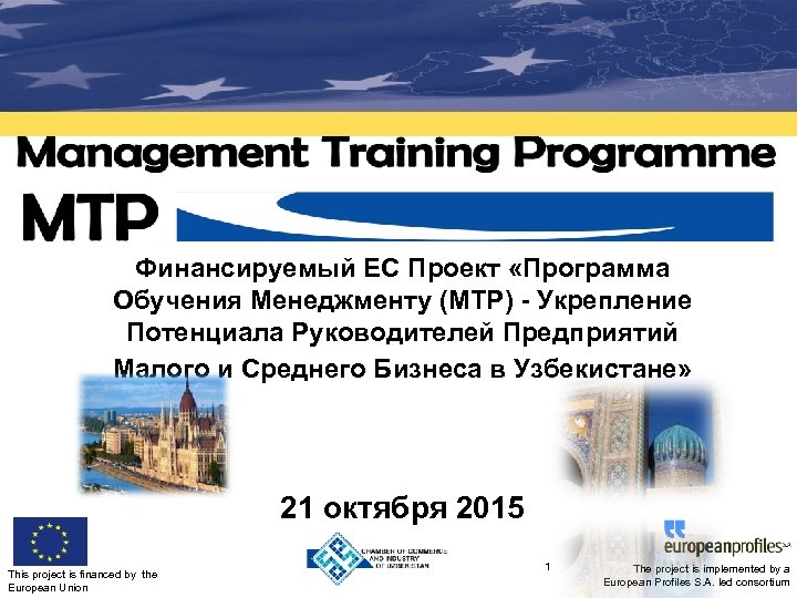 Финансируемый ЕС Проект «Программа Обучения Менеджменту (MTP) - Укрепление Потенциала Руководителей Предприятий Малого и Среднего Бизнеса в Узбекистане» 21 октября 2015 This project is financed by the European Union 1 The project is implemented by a European Profiles S. A. led consortium