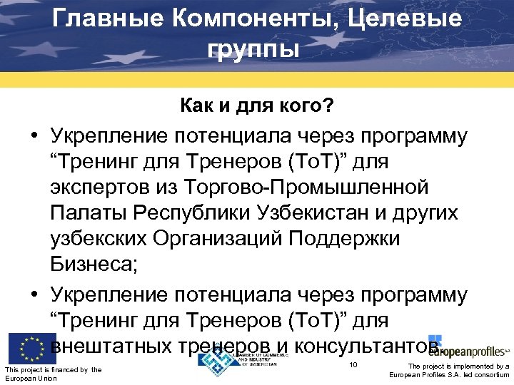 Главные Компоненты, Целевые группы Как и для кого? • Укрепление потенциала через программу “Тренинг для Тренеров (То. Т)” для экспертов из Торгово-Промышленной Палаты Республики Узбекистан и других узбекских Организаций Поддержки Бизнеса; • Укрепление потенциала через программу “Тренинг для Тренеров (То. Т)” для внештатных тренеров и консультантов. This project is financed by the European Union 10 The project is implemented by a European Profiles S. A. led consortium
