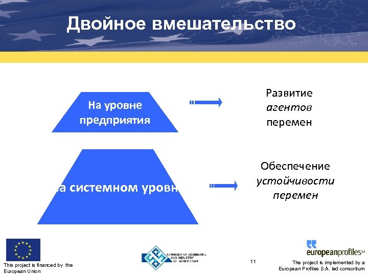 Двойное вмешательство Развитие агентов перемен На уровне предприятия , Обеспечение устойчивости перемен На системном уровне This project is financed by the European Union 11 The project is implemented by a European Profiles S. A. led consortium