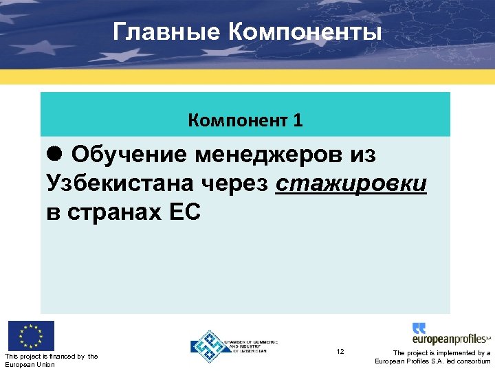 Главные Компоненты Компонент 1 Обучение менеджеров из Узбекистана через стажировки в странах ЕС This project is financed by the European Union 12 The project is implemented by a European Profiles S. A. led consortium