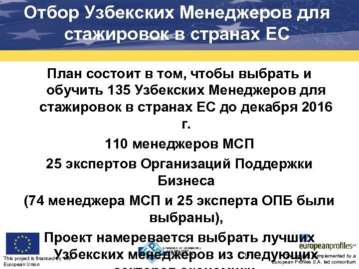 Отбор Узбекских Менеджеров для стажировок в странах ЕС План состоит в том, чтобы выбрать и обучить 135 Узбекских Менеджеров для стажировок в странах ЕС до декабря 2016 г. 110 менеджеров МСП 25 экспертов Организаций Поддержки Бизнеса (74 менеджера МСП и 25 эксперта ОПБ были выбраны), Проект намеревается выбрать лучших Узбекских менеджеров из следующих This project is financed by the European Union 13 The project is implemented by a European Profiles S. A. led consortium