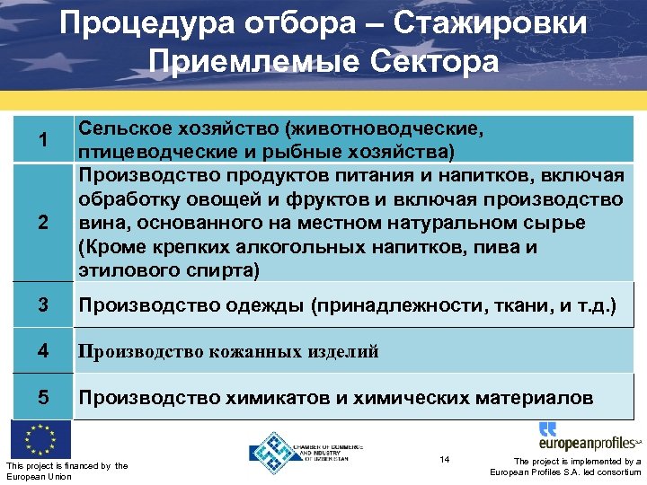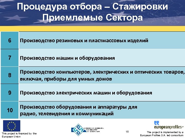 Процедура отбора – Стажировки Приемлемые Сектора 1 2 Сельское хозяйство (животноводческие, птицеводческие и рыбные хозяйства) Производство продуктов питания и напитков, включая обработку овощей и фруктов и включая производство вина, основанного на местном натуральном сырье (Кроме крепких алкогольных напитков, пива и этилового спирта) 3 Производство одежды (принадлежности, ткани, и т. д. ) 4 Производство кожанных изделий 5 Производство химикатов и химических материалов This project is financed by the European Union 14 The project is implemented by a European Profiles S. A. led consortium