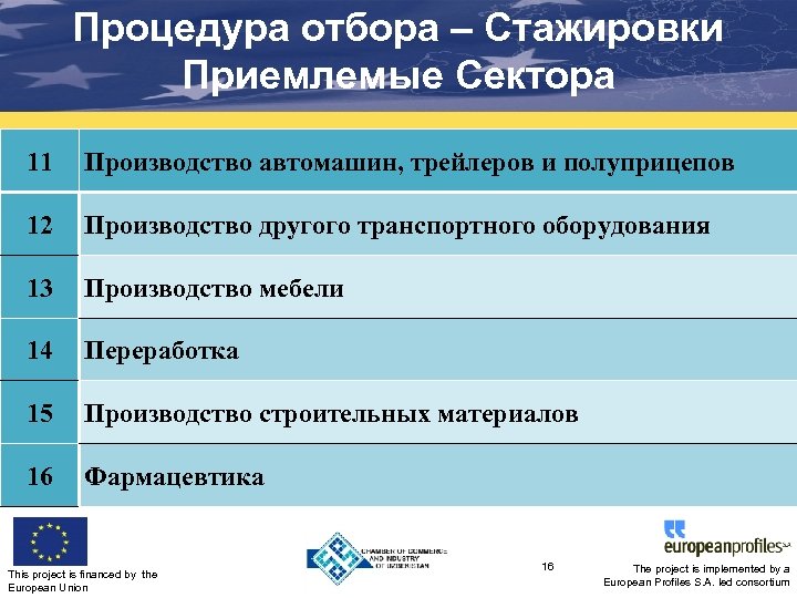 Процедура отбора – Стажировки Приемлемые Сектора 6 Производство резиновых и пластмассовых изделий 7 Производство машин и оборудования 8 Производство компьютеров, электрических и оптических товаров, включая, приборы для умных домов 9 Производство электрических машин и оборудования 10 Производство оборудования и аппаратуры для радио, телевидения и коммуникаций This project is financed by the European Union 15 The project is implemented by a European Profiles S. A. led consortium