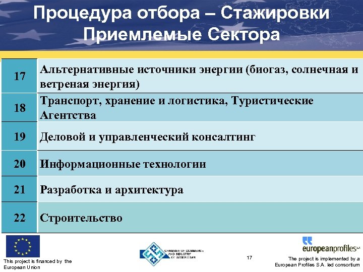 Процедура отбора – Стажировки Приемлемые Сектора 11 Производство автомашин, трейлеров и полуприцепов 12 Производство другого транспортного оборудования 13 Производство мебели 14 Переработка 15 Производство строительных материалов 16 Фармацевтика This project is financed by the European Union 16 The project is implemented by a European Profiles S. A. led consortium