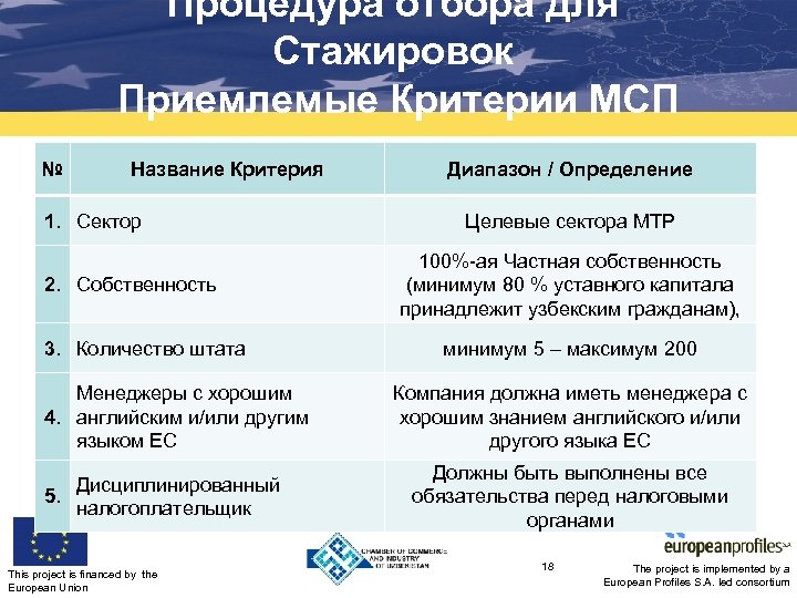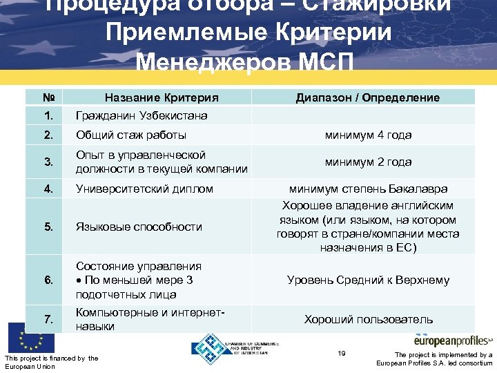 Процедура отбора для Стажировок Приемлемые Критерии МСП № Название Критерия 1. Сектор 2. Собственность 3. Количество штата Менеджеры с хорошим 4. английским и/или другим языком ЕС Дисциплинированный 5. налогоплательщик This project is financed by the European Union Диапазон / Определение Целевые сектора MTP 100%-ая Частная собственность (минимум 80 % уставного капитала принадлежит узбекским гражданам), минимум 5 – максимум 200 Компания должна иметь менеджера с хорошим знанием английского и/или другого языка ЕС Должны быть выполнены все обязательства перед налоговыми органами 18 The project is implemented by a European Profiles S. A. led consortium