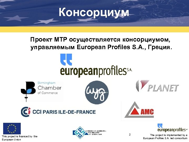 Консорциум Проект MTP осуществляется консорциумом, управляемым European Profiles S. A. , Греция. This project is financed by the European Union 2 The project is implemented by a European Profiles S. A. led consortium