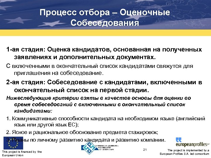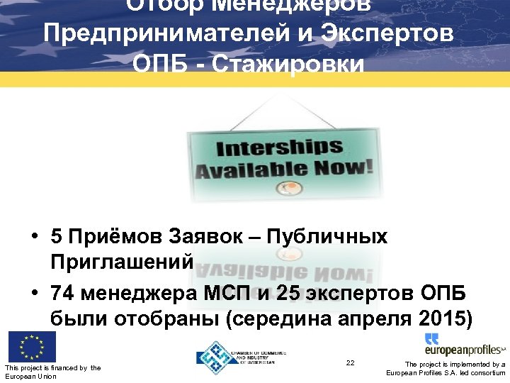 Процесс отбора – Оценочные Собеседования 1 -ая стадия: Оценка кандидатов, основанная на полученных заявлениях и дополнительных документах. С включенными в окончательный список кандидатами свяжутся для приглашения на собеседование. 2 -ая стадия: Собеседование с кандидатами, включенными в окончательный список на первой стадии. Нижеследующие критерии взяты в качестве основы для оценки во время собеседований с включенными в окончательный список кандидатами: 1. Коммуникативные способности кандидата на необходимом языке (английский язык или другой язык ЕС); 2. Ясное и рациональное обоснование предмета стажировок; 3. Планы по личному развитию кандидата и развитию компании. This project is financed by the European Union 21 The project is implemented by a European Profiles S. A. led consortium