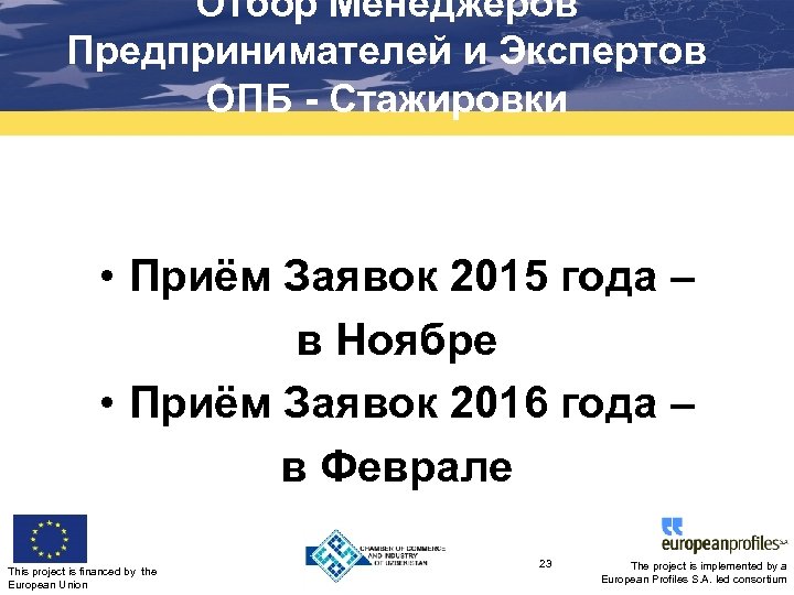 Отбор Менеджеров Предпринимателей и Экспертов ОПБ - Стажировки • 5 Приёмов Заявок – Публичных Приглашений • 74 менеджера МСП и 25 экспертов ОПБ были отобраны (середина апреля 2015) This project is financed by the European Union 22 The project is implemented by a European Profiles S. A. led consortium