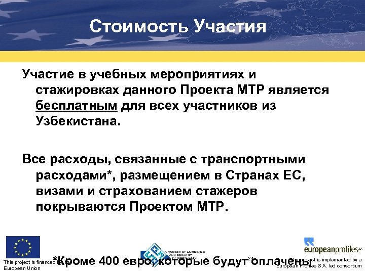 Стоимость Участия Участие в учебных мероприятиях и стажировках данного Проекта MTP является бесплатным для всех участников из Узбекистана. Все расходы, связанные с транспортными расходами*, размещением в Странах ЕС, визами и страхованием стажеров покрываются Проектом MTP. The project implemented by a *Кроме 400 евро, которые будут24 оплачены is. S. A. led consortium European Profiles This project is financed by the European Union