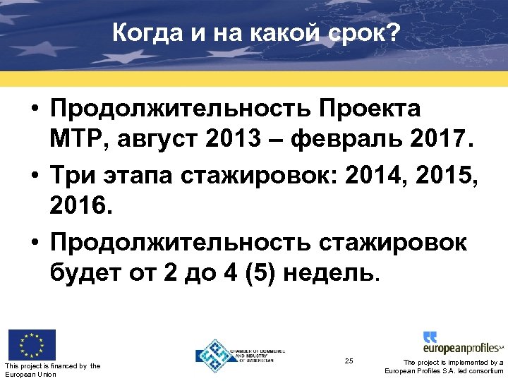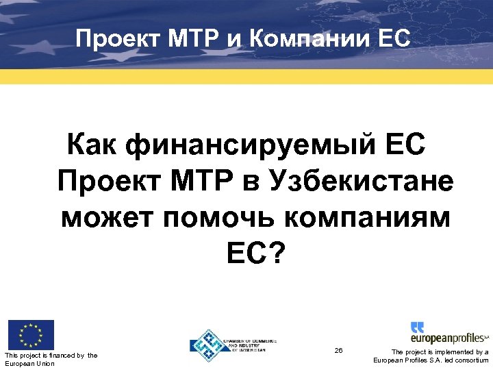 Когда и на какой срок? • Продолжительность Проекта MTP, август 2013 – февраль 2017. • Три этапа стажировок: 2014, 2015, 2016. • Продолжительность стажировок будет от 2 до 4 (5) недель. This project is financed by the European Union 25 The project is implemented by a European Profiles S. A. led consortium