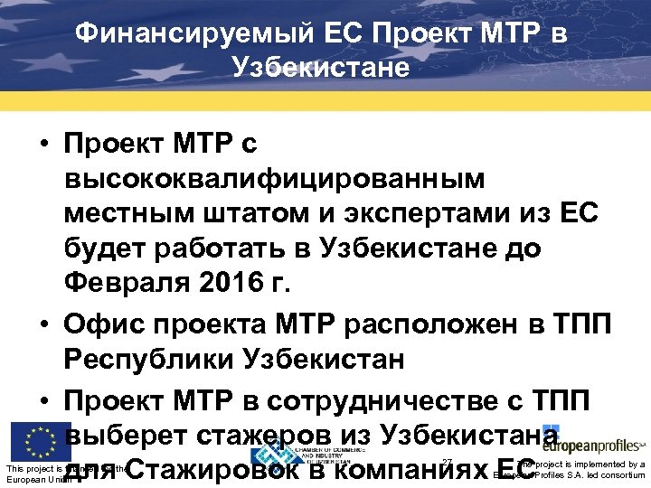 Проект MTP и Компании ЕС Как финансируемый ЕС Проект MTP в Узбекистане может помочь компаниям ЕС? This project is financed by the European Union 26 The project is implemented by a European Profiles S. A. led consortium