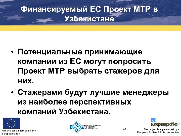 Финансируемый ЕС Проект MTP в Узбекистане • Проект MTP с высококвалифицированным местным штатом и экспертами из ЕС будет работать в Узбекистане до Февраля 2016 г. • Офис проекта MTP расположен в ТПП Республики Узбекистан • Проект MTP в сотрудничестве с ТПП выберет стажеров из Узбекистана для Стажировок в компаниях ЕС This project is financed by the European Union 27 The project is implemented by a European Profiles S. A. led consortium