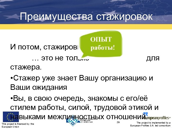 , …. . Стажировки часто приводят к чемуто большему! This project is financed by the European Union 30 The project is implemented by a European Profiles S. A. led consortium