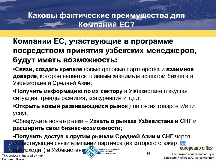 MTP является платформой для расширения Вашего бизнеса в Узбекистане и Средней Азии Как Вы можете использовать MTP для создания деловых отношений с узбекскими компаниями? Компании из Европейского Союза, заинтересованные в создании деловых отношений с предприятиями из Узбекистана могут использовать программу Стажировок проекта MTP, принимая менеджеров из Узбекистана в течение 2 -4 недель. Когда? Октябрь 2015 г. – декабрь 2016 г. This project is financed by the European Union 33 The project is implemented by a European Profiles S. A. led consortium