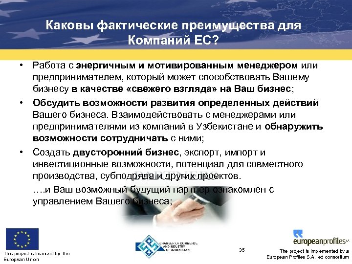 Каковы фактические преимущества для Компаний ЕС? Компании ЕС, участвующие в программе посредством принятия узбекских менеджеров, будут иметь возможность: • Связи, создать крепкие новые деловые партнерства и взаимное доверие, которое является главным значимым аспектом бизнеса в Узбекистане и Средней Азии; • Получить информацию по их сектору в Узбекистане (текущая ситуация, тренды развития, конкуренция и т. д. ); • Открыть новый развивающийся рынок для своих товаров и/или услуг; • Обнаружить новые рынки – Узнать о рынках Узбекистана и СНГ и расширить свои бизнес-возможности; • Получить доступ к другим рынкам Средней Азии и СНГ через существующие связи компании партнера (из которого стажер происходит) в Узбекистане; 34 This project is financed by the European Union The project is implemented by a European Profiles S. A. led consortium