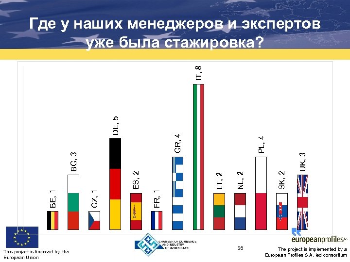 This project is financed by the European Union 36 UK, 3 SK, 2 NL, 2 LT, 2 PL, 4 GR, 4 FR, 1 ES, 2 CZ, 1 BE, 1 BG, 3 DE, 5 IT, 8 Где у наших менеджеров и экспертов уже была стажировка? The project is implemented by a European Profiles S. A. led consortium