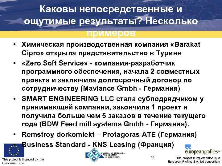 Каковы непосредственные и ощутимые результаты? Несколько примеров • Химическая производственная компания «Barakat Cipro» открыла представительство в Турине • «Zero Soft Service» - компания-разработчик программного обеспечения, начала 2 совместных проекта и заключила долгосрочный договор по сотрудничеству (Maviance Gmbh - Германия) • SMART ENGINEERING LLC стала субподрядчиком у принимающей компании, закончила 1 проект и получила больше чем 5 заказов в течение текущего года (BDW Feed mill systems Gmbh - Германия). • Remstroy dorkomlekt – Protagoras ATE (Германия) • Business Standard - KNS Leasing (Франция) This project is financed by the European Union 38 The project is implemented by a European Profiles S. A. led consortium