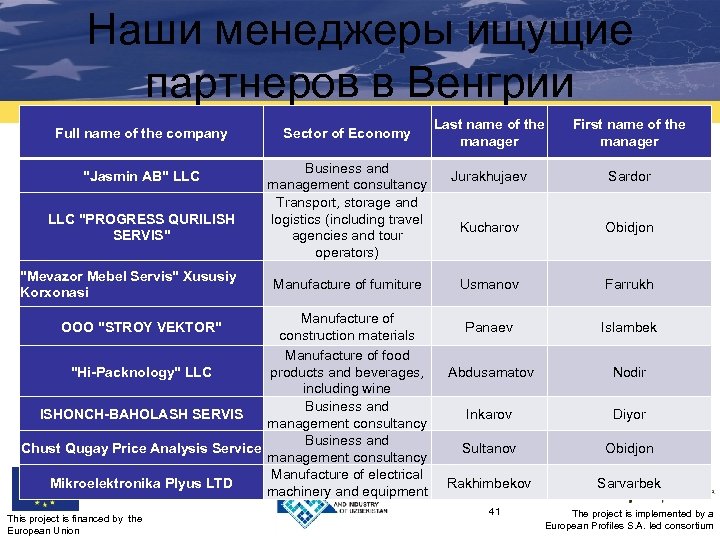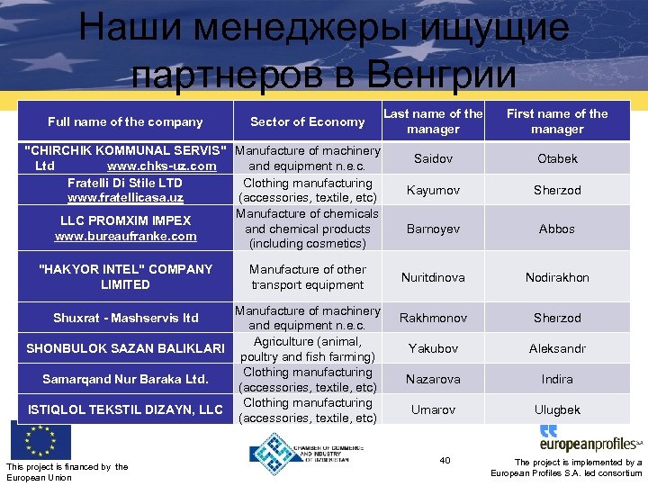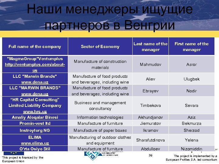 Наши менеджеры ищущие партнеров в Венгрии Sector of Economy Last name of the manager First name of the manager Manufacture of construction materials Mahmudov Asror Aliev Ulugbek Ebrayev Nodir Business and management consultancy Timbekova Sevara Information technologies Manufacture of furniture Akhundjanov Jiemuratov Aziz Bekmurza Instroytorg NG Manufacture of paper boxes Ikramov Sherzod ELIMA www. elima. uz O'rta Osiyo Stil Manufacturing of outdoor clothes and equipment Manufacture of furniture Sharafutdinova Yelena Abdulloev Nizomiddin 39 The project is implemented by a European Profiles S. A. led consortium Full name of the company "Magma. Group"Ventumplus http: //ventumplus. com/aboutus LLC "Marwin Brands" www. dena. uz LLC "MARWIN BRANDS" www. dena. uz “HR Capital Consulting” Limited Liability Company www. hrc. uz Amaliy Aloqalar Binesi Promin-vest ltd This project is financed by the European Union Manufacture of food products and beverages, including wine