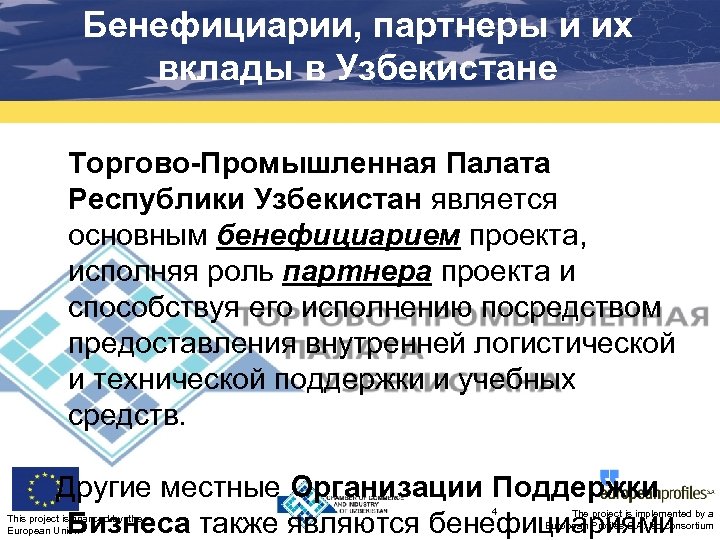 Бенефициарии, партнеры и их вклады в Узбекистане Торгово-Промышленная Палата Республики Узбекистан является основным бенефициарием проекта, исполняя роль партнера проекта и способствуя его исполнению посредством предоставления внутренней логистической и технической поддержки и учебных средств. Другие местные Организации Поддержки Бизнеса также являются бенефициариями This project is financed by the European Union 4 The project is implemented by a European Profiles S. A. led consortium
