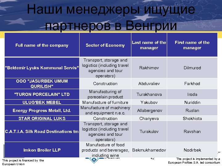 Наши менеджеры ищущие партнеров в Венгрии Full name of the company "Jasmin AB" LLC "PROGRESS QURILISH SERVIS" "Mevazor Mebel Servis" Xususiy Korxonasi Sector of Economy Business and management consultancy Transport, storage and logistics (including travel agencies and tour operators) Manufacture of furniture Manufacture of construction materials Manufacture of food products and beverages, "Hi-Packnology" LLC including wine Business and ISHONCH-BAHOLASH SERVIS management consultancy Business and Chust Qugay Price Analysis Service management consultancy Manufacture of electrical Mikroelektronika Plyus LTD machinery and equipment ООО "STROY VEKTOR" This project is financed by the European Union Last name of the manager First name of the manager Jurakhujaev Sardor Kucharov Obidjon Usmanov Farrukh Panaev Islambek Abdusamatov Nodir Inkarov Diyor Sultanov Obidjon Rakhimbekov Sarvarbek 41 The project is implemented by a European Profiles S. A. led consortium