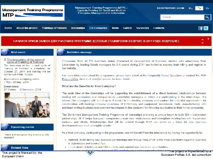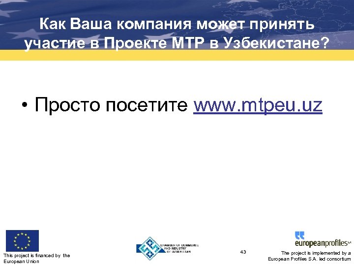Как Ваша компания может принять участие в Проекте MTP в Узбекистане? • Просто посетите www. mtpeu. uz This project is financed by the European Union 43 The project is implemented by a European Profiles S. A. led consortium