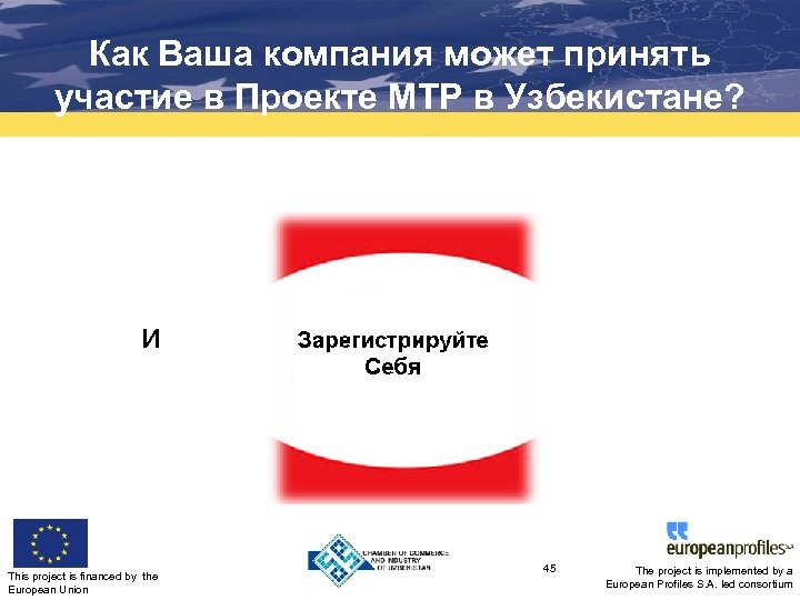 Как Ваша компания может принять участие в Проекте MTP в Узбекистане? и This project is financed by the European Union 45 The project is implemented by a European Profiles S. A. led consortium