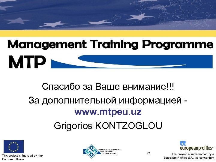 . Спасибо за Ваше внимание!!! За дополнительной информацией www. mtpeu. uz Grigorios KONTZOGLOU This project is financed by the European Union 47 The project is implemented by a European Profiles S. A. led consortium