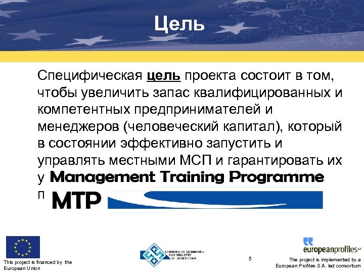 Цель Специфическая цель проекта состоит в том, чтобы увеличить запас квалифицированных и компетентных предпринимателей и менеджеров (человеческий капитал), который в состоянии эффективно запустить и управлять местными МСП и гарантировать их устойчивое развитие в долгосрочной перспективе. This project is financed by the European Union 5 The project is implemented by a European Profiles S. A. led consortium
