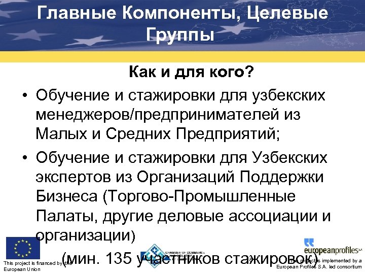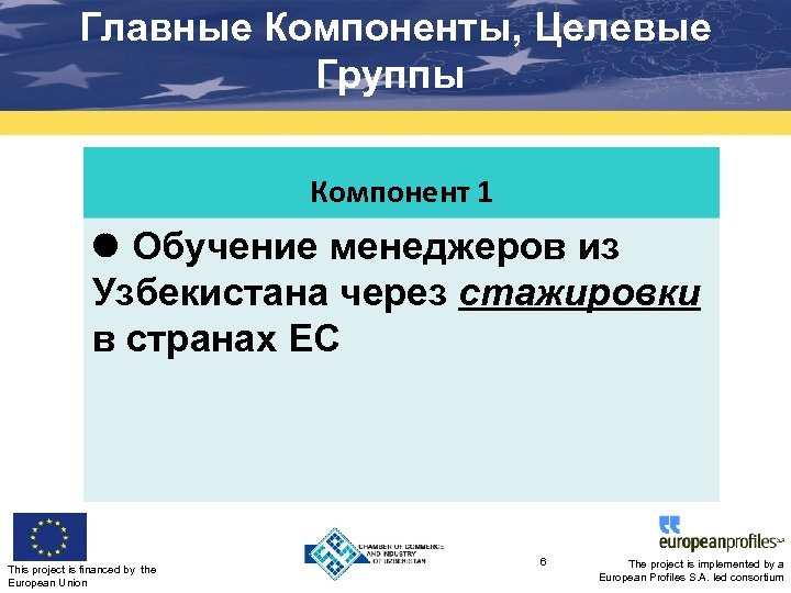 Главные Компоненты, Целевые Группы Компонент 1 Обучение менеджеров из Узбекистана через стажировки в странах ЕС This project is financed by the European Union 6 The project is implemented by a European Profiles S. A. led consortium