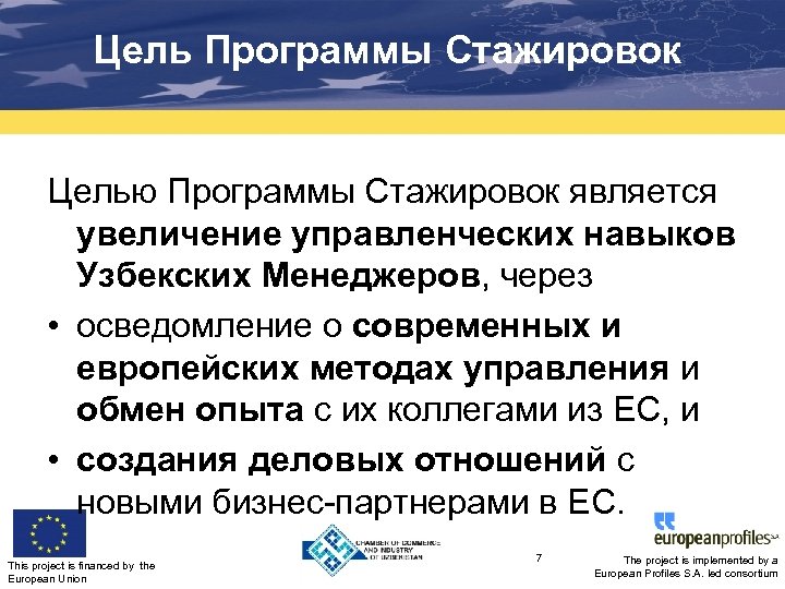 Цель Программы Стажировок Целью Программы Стажировок является увеличение управленческих навыков Узбекских Менеджеров, через • осведомление о современных и европейских методах управления и обмен опыта с их коллегами из ЕС, и • создания деловых отношений с новыми бизнес-партнерами в ЕС. This project is financed by the European Union 7 The project is implemented by a European Profiles S. A. led consortium