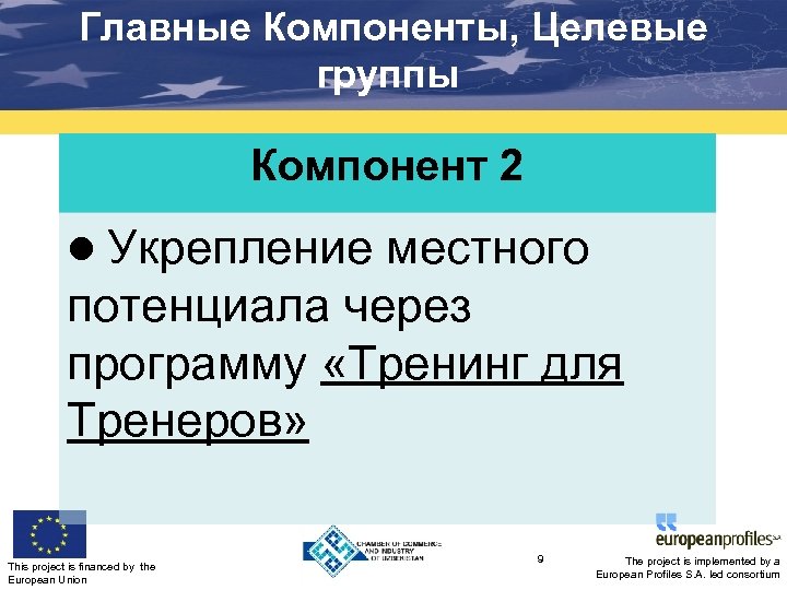 Главные Компоненты, Целевые группы Компонент 2 Укрепление местного потенциала через программу «Тренинг для Тренеров» This project is financed by the European Union 9 The project is implemented by a European Profiles S. A. led consortium