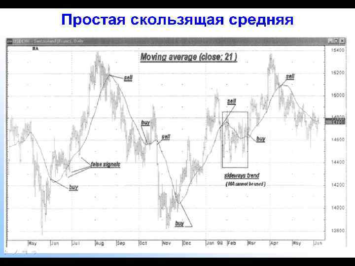 Методика применения скользящих средних для покупки и продажи. 1. На практике чаще используют МА, т. к. зрительно различия их от ЕМА не столь существенны и процедура расчетов гораздо проще. 2. При использовании нескольких МА с различными интервалами сглаживания, МА с большим интервалом служит для выявления тенденции, с более коротким – для выявления момента с в е р ш е н и я с д е л к и. 3. При использовании нескольких МА с различными периодами наиболее сильный сигнал возникает в том случае, когда все они пересекаются и меняются местами по отношению к графику цен. Н е д о с т а т к и Сигналы МА запаздывают. Чтобы сигналы были точнее, необходимо выбирать меньший порядок сглаживания. МА является индикатором, действующим только в условиях явно выраженного тренда. При боковом тренде количество ложных сигналов слишком велико, что неизбежно п р и в о д и т к п о т е р я м.