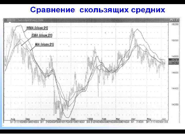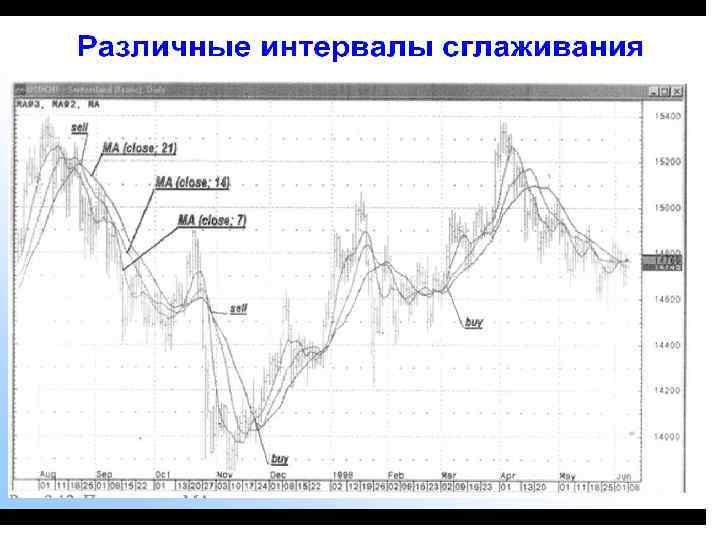 Скользящие средние (Moving Average - сокращенно MA). • Ввиду того, что движение цен подвержено флуктуациям, для получения более наглядной информации о наличии тренда производят сглаживание данных. После сглаживания тренд прослеживается более явственно. Поэтому МА является как бы индикатором тренда. Под «интервалом сглаживания» (или «интервалом» ), равным n, здесь и в дальнейшем будем понимать интервал в n дней (часов, минут и т. д. ). Для расчета МА и других функций обычно используют цены закрытия.