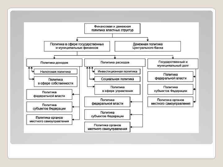 Составляющие финансовой политики государства: денежно-кредитная политика; налоговая политика; бюджетная политика; политика в области международных финансов.