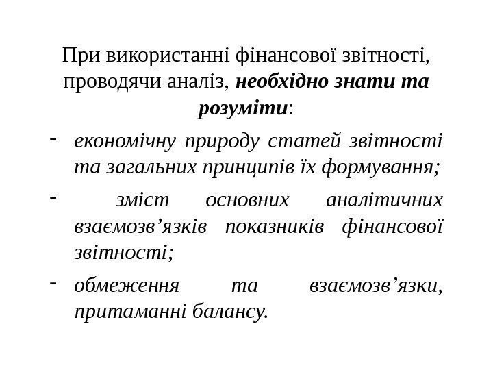 При використанні фінансової звітності, проводячи аналіз, необхідно знати та розуміти : — економічну природу статей звітності та загальних принципів їх формування; — зміст основних аналітичних взаємозв’язків показників фінансової звітності; — обмеження та взаємозв’язки, притаманні балансу.