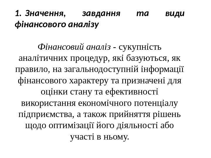 1. Значення, завдання та види фінансового аналізу Фінансовий аналіз — сукупність аналітичних процедур, які базуються, як правило, на загальнодоступній інформації фінансового характеру та призначені для оцінки стану та ефективності використання економічного потенціалу підприємства, а також прийняття рішень щодо оптимізації його діяльності або участі в ньому.