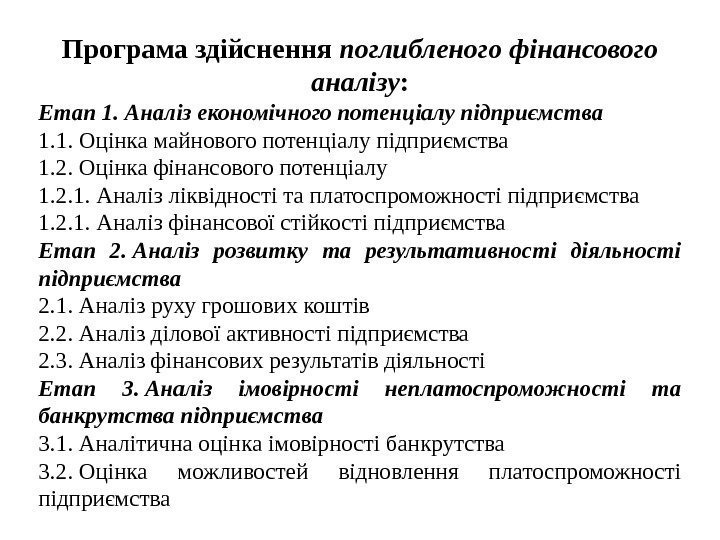 Програма здійснення поглибленого фінансового аналізу : Етап 1. Аналіз економічного потенціалу підприємства 1. 1. Оцінка майнового потенціалу підприємства 1. 2. Оцінка фінансового потенціалу 1. 2. 1. Аналіз ліквідності та платоспроможності підприємства 1. 2. 1. Аналіз фінансової стійкості підприємства Етап 2. Аналіз розвитку та результативності діяльності підприємства 2. 1. Аналіз руху грошових коштів 2. 2. Аналіз ділової активності підприємства 2. 3. Аналіз фінансових результатів діяльності Етап 3. Аналіз імовірності неплатоспроможності та банкрутства підприємства 3. 1. Аналітична оцінка імовірності банкрутства 3. 2. Оцінка можливостей відновлення платоспроможності підприємства